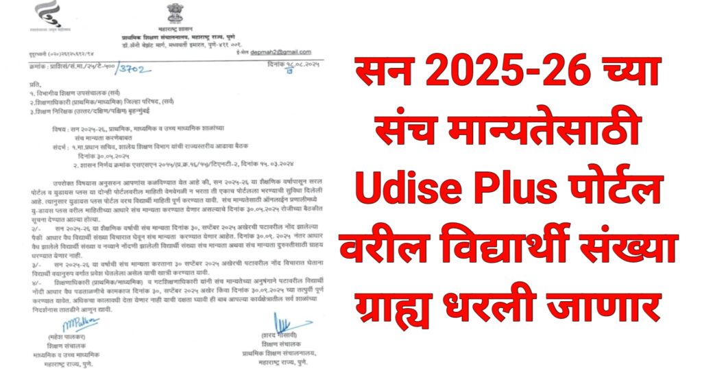 30 मे 2025 रोजी झालेल्या बैठकीत याबाबत सूचना देण्यात आल्या होत्या. त्यानुसार पुढे संच मान्यतेसाठी लागणारी माहिती देखील केवळ यू-डायस प्लस पोर्टलवर उपलब्ध असलेल्या नोंदींवर आधारित राहील.