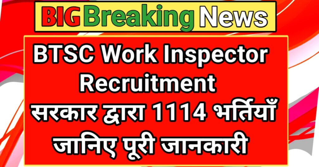 अगर आप बिहार राज्य में सरकारी नौकरी की तलाश कर रहे हैं, तो आपके लिए एक सुनहरा मौका आ चुका है। बिहार तकनीकी सेवा आयोग (BTSC) ने 2025 में वर्क इंस्पेक्टर (Work Inspector) पदों पर बड़ी भर्ती का ऐलान किया है। इस भर्ती के तहत कुल 1114 पदों पर योग्य उम्मीदवारों से आवेदन आमंत्रित किए गए हैं।