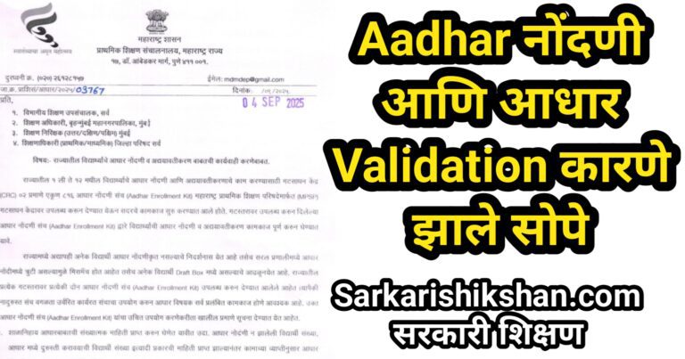 7. ३० सप्टेंबर २०२५ पूर्वी राज्यातील सर्व विद्यार्थ्यांची आधार नोंदणी व अद्ययावतीकरण पूर्ण होणं बंधनकारक आहे. मुख्याध्यापकांनी स्वतः खात्री करून प्रत्येक विद्यार्थी सरल प्रणालीमध्ये योग्यप्रकारे नोंदणीकृत आहे, हे सुनिश्चित करावं.